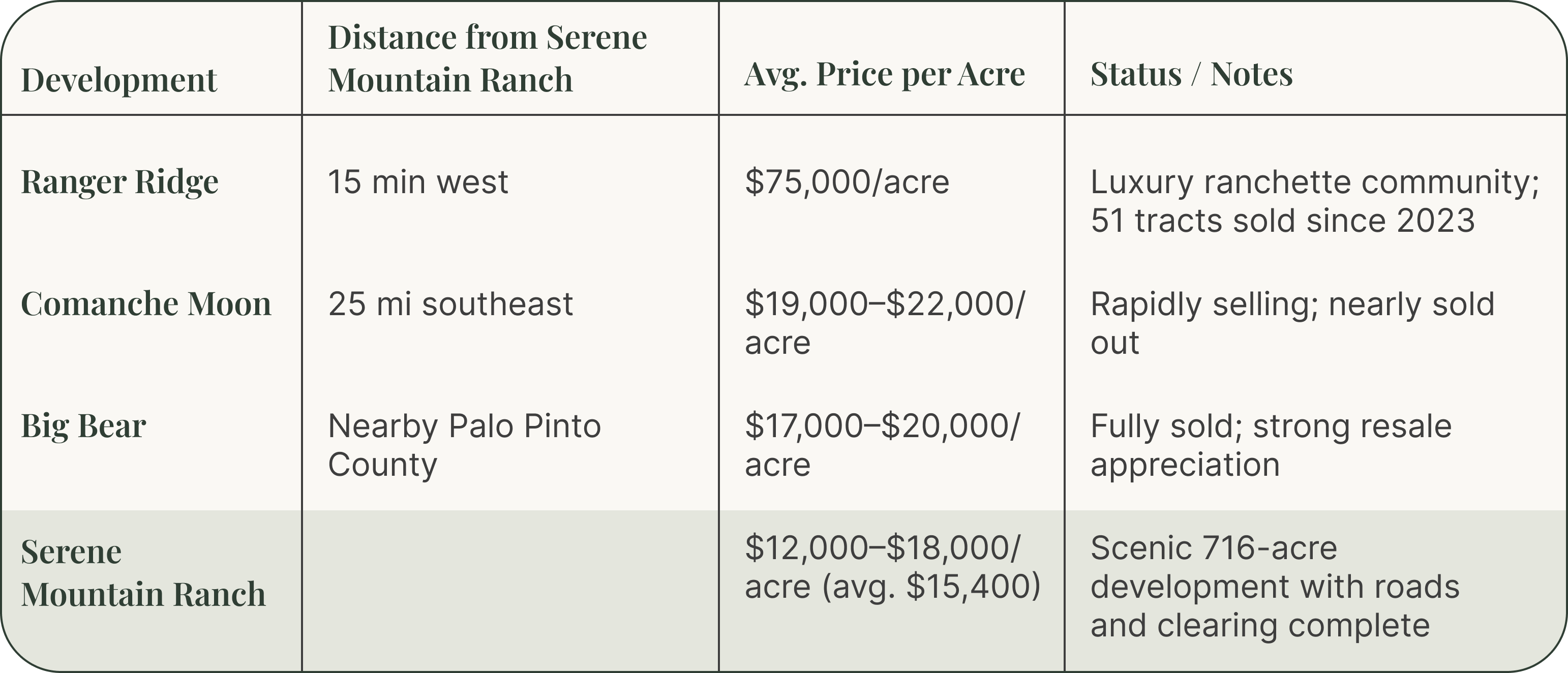 A limited opportunity to invest in the 716-acre Serene Mountain Ranch development in Palo Pinto County, TX — a proven market for luxury ranchettes near DFW.